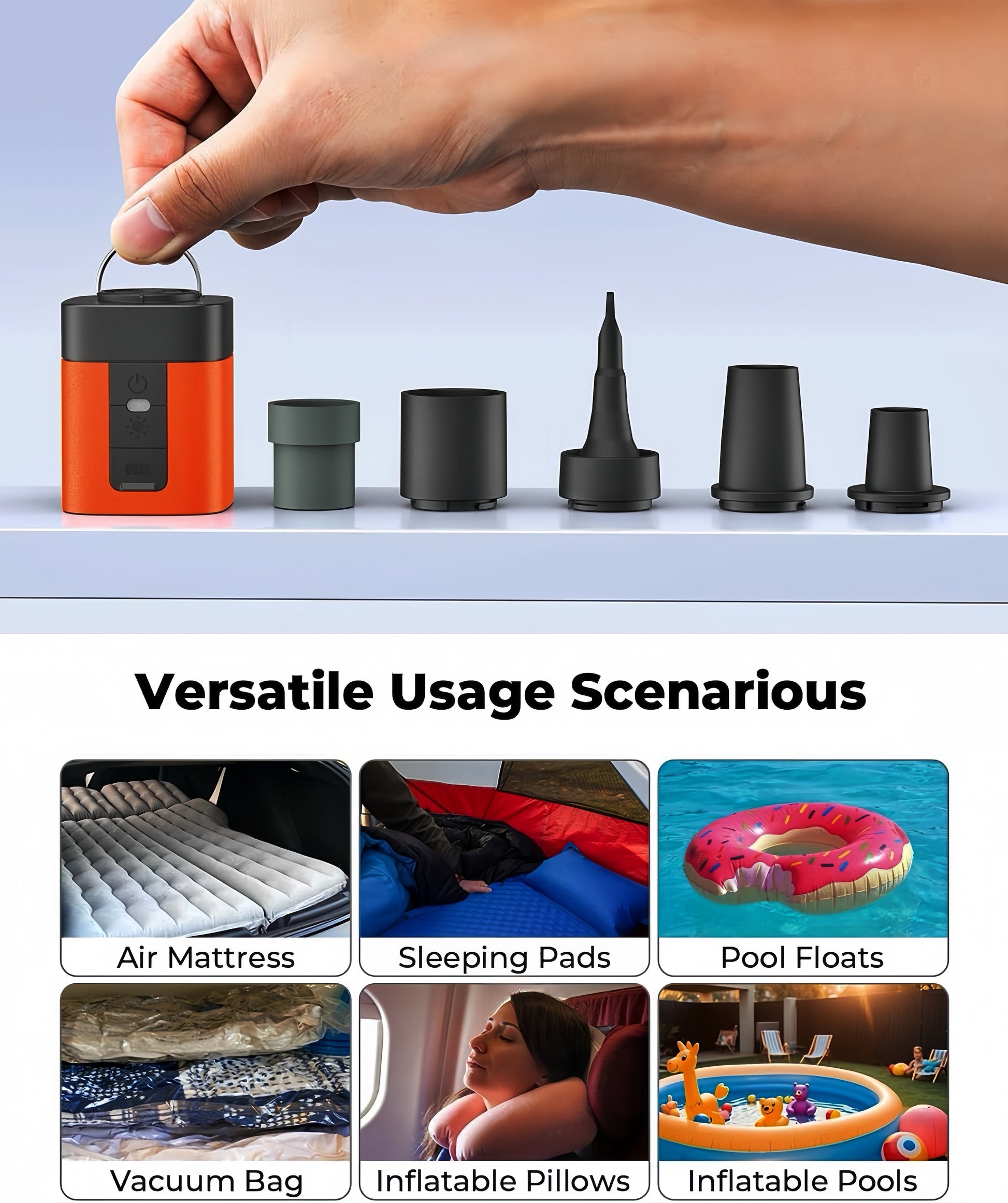 More than just an inflator, AirBurst Pro also functions as a vacuum pump, helping you compress storage bags and save valuable space in your luggage or closet. It comes equipped with multiple nozzle heads to fit various items like air loungers, sleeping pads, vacuum bags, and more. A built-in LED light adds convenience for night setups or emergency use.