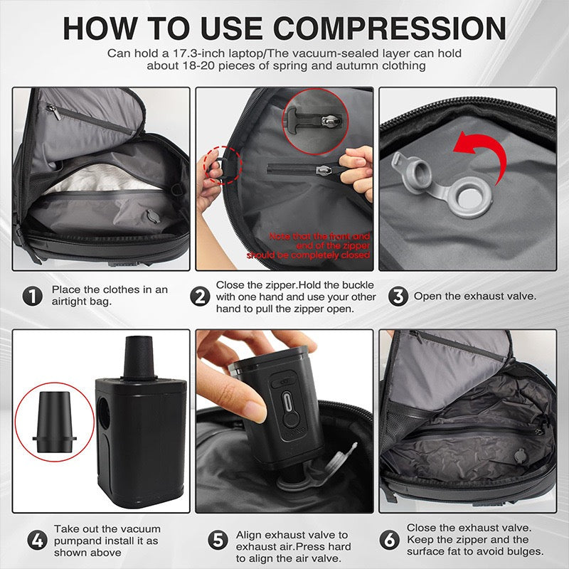 Built-in vacuum compression compartment with included USB-C rechargeable pump