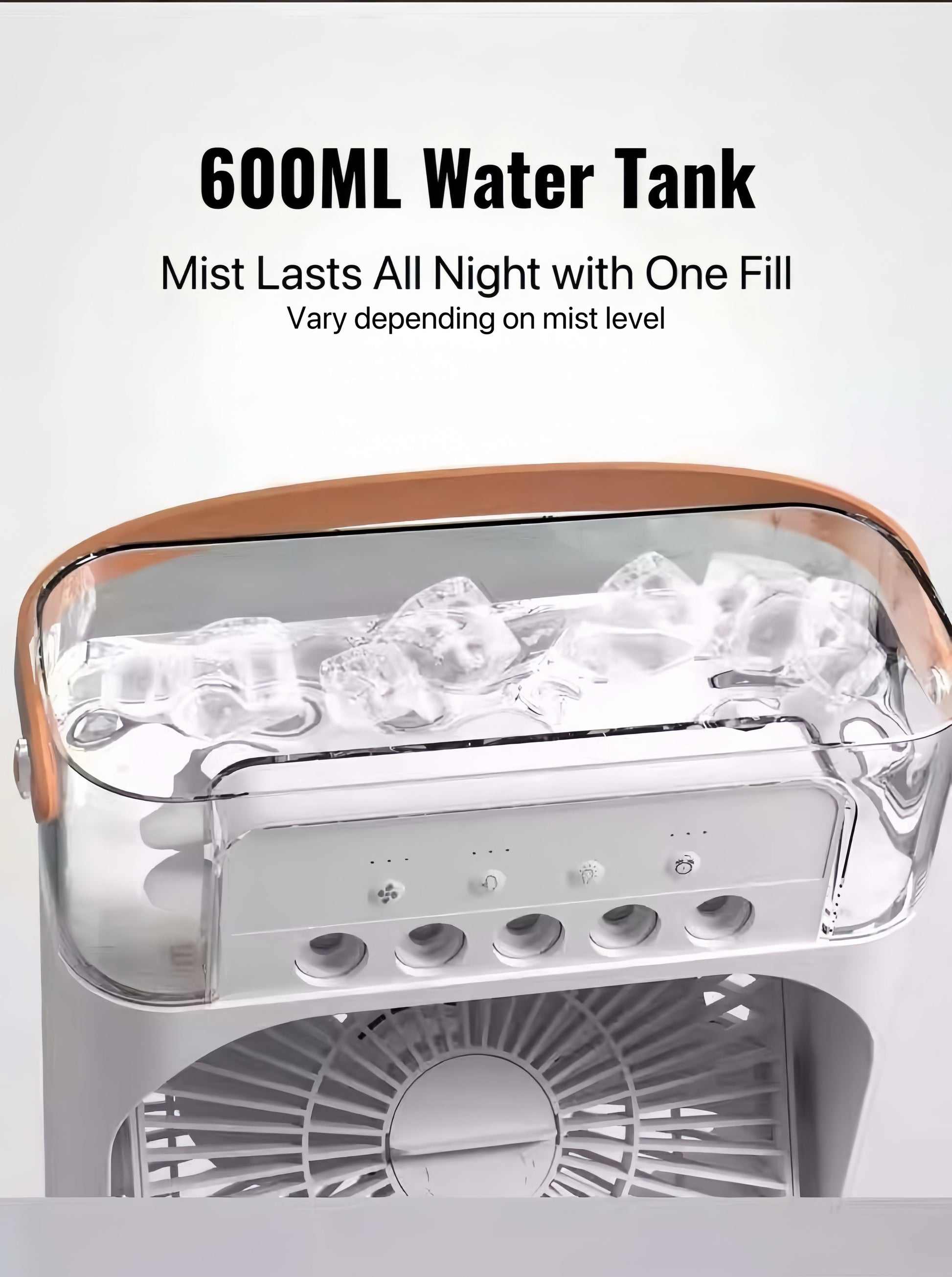 Includes a 1/2/3 hour auto shut-off timer, adjustable tilt, portable handle, and 7-color ambient light. USB-powered and easy to refill, it’s ideal for bedside use, desks, or anywhere you need a personal cooling upgrade.